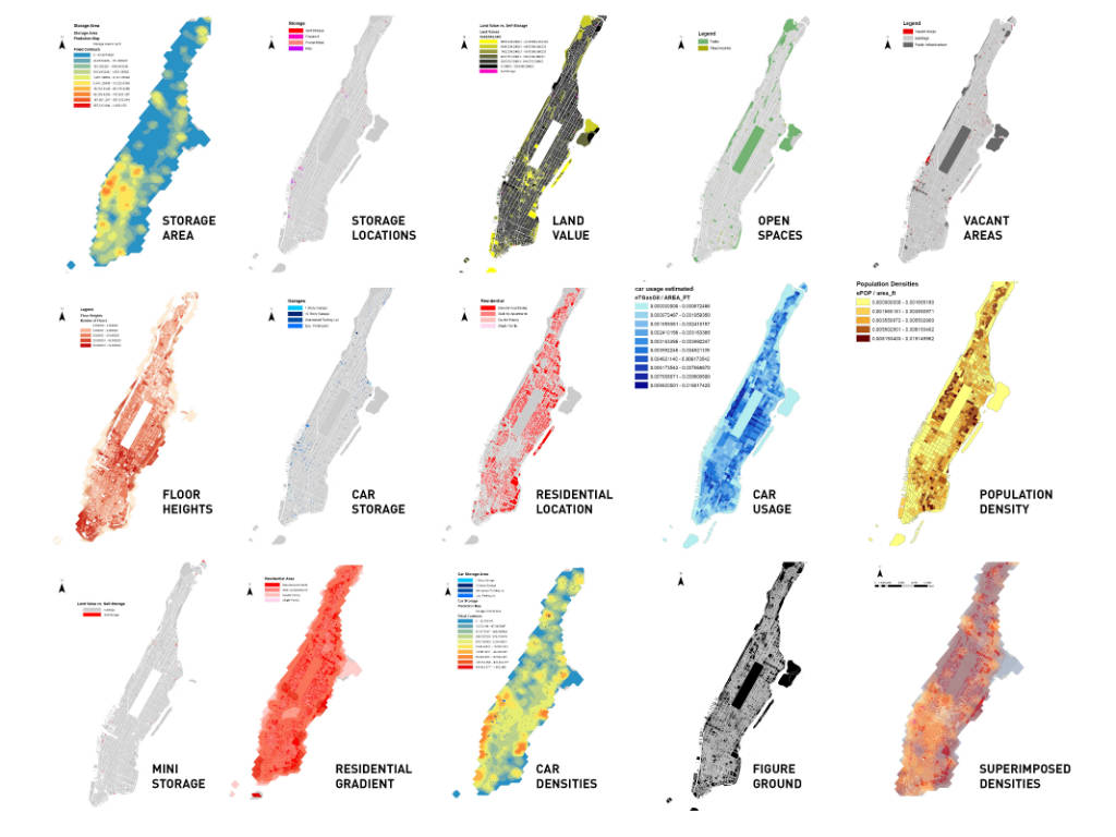 When the average square footage of storage is calculated and multiplied by population of manhattan, we subdivided accordingly to where people lived and population density in those areas. The result is an axis of stuff hubs, where any individual's residence is no more than .5 miles from their potential satellite storage.