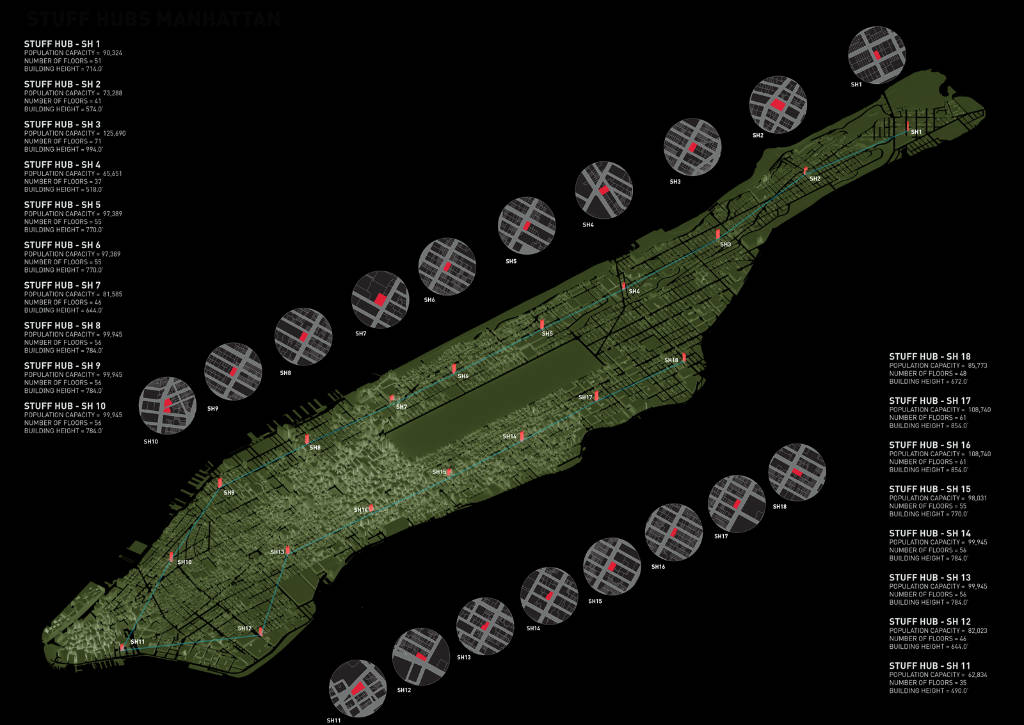 description: The stuff hub, a project derivative of intense research on America's increasingly desired storage habits, seeks to situate itself into the urban context as a system of dense towers, designed to store all of New Yorker's seasonal property in a single generational instance.
