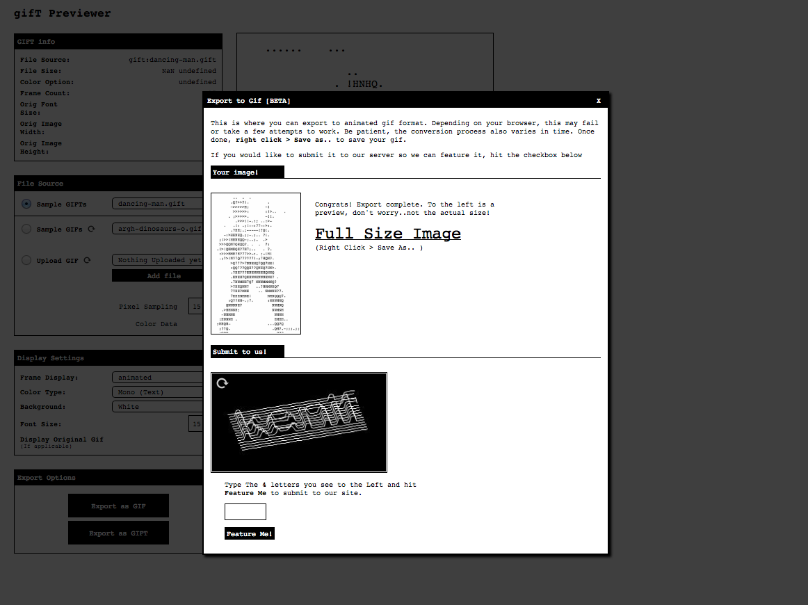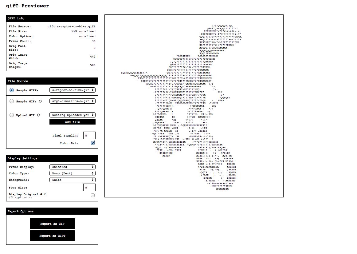 Introducing gifTs. Convert your favorite animated gif's to Animated ascii text. Why? Why not. A small "for funsies" project to do just that. Try sample gifs, upload your own, and then export them to your computer as ascii gifs / submit them to the site!