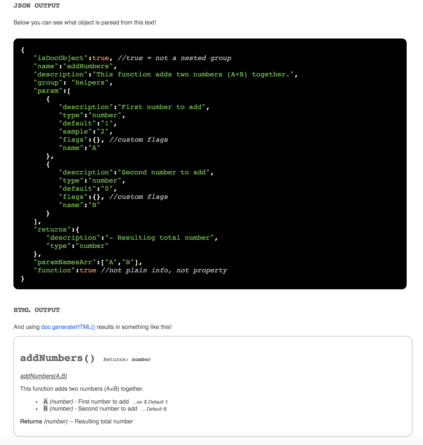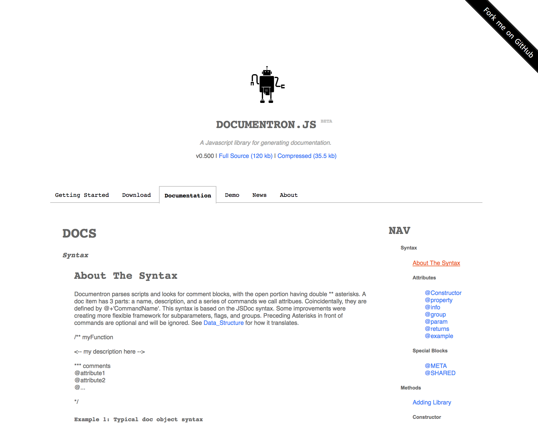Documentron is a javascript library for quicker documentation by Chris Malcolm. Documentron parses scripts and looks for comment blocks, with the open portion having double ** asterisks. Documentron's documentation is actually documented by itself!