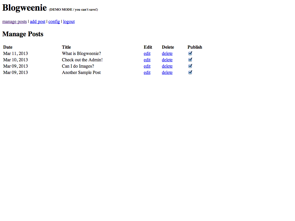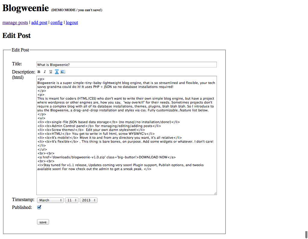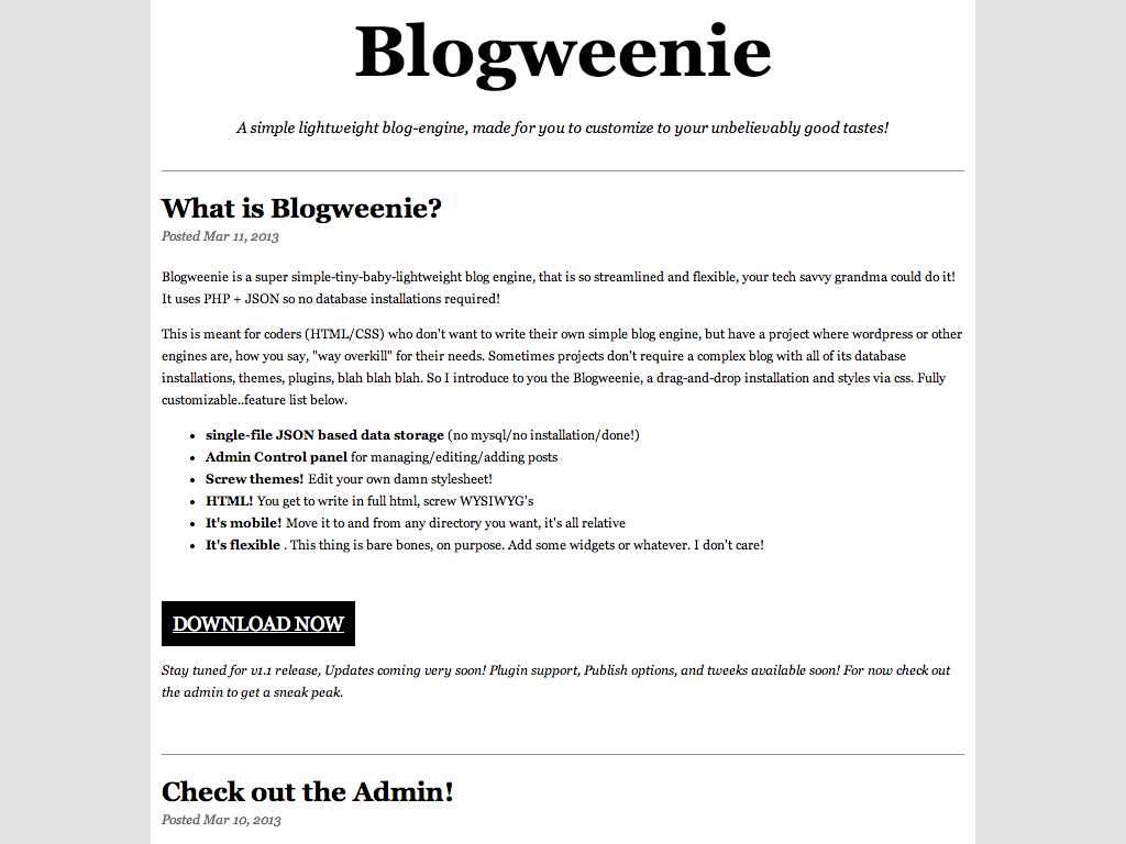 Blogweenie is a super simple-tiny-baby-lightweight blog engine, that is so streamlined and flexible, your tech savvy grandma could do it! It uses PHP JSON so no database installations required! Extremely bare bones on purpose!