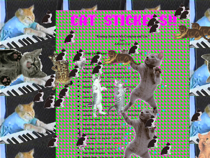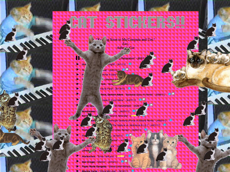 Catsticker.com is a mysterious force of nature that spontaneously arose from the deep depths of pure joy and happiness, never to occur again for another three trillion years. It's perfection can be compared to that of fresh sizzling bacon, dolphins in the sunset, warm hazelnut cookies, and the rare but delicious skittlefairy. On top of these features, the site also boasts a (somewhat daily) music blog and a ton of cats...all curated by none other than the infamous adhesiv cat. 2.0 takes the site to the next level, by integrating social features such as user accounts, crowdsourced music uploads, favorite playlists, and more.