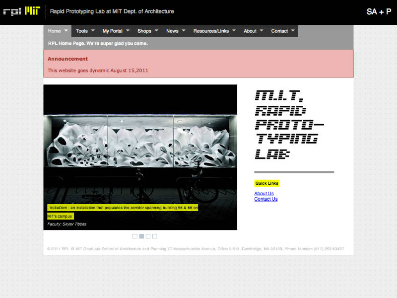 The MIT Architecture Department's Rapid Prototyping Lab provides equipment and software that students and faculty can use to fabricate physical objects from 3d models and CAD drawings. The Facility also manages MIT SAP's wood shop's and fab lab facilities. The project was to transition MIT's signup sheets from the archaic manual method of paper and pen to an online calendar system where students can sign up for various machinery. The site featured a fully automated calendar signup sytem, equipped with admin panel, personal portal of timesheets, and certificate authentication. The site has since gone aesthetic changes.