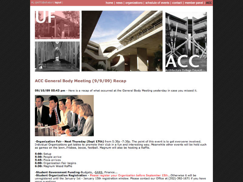 This was a site design for the Architectural College Council (ACC) for the University of Florida. The purpose of the site was to inform Architecture students of upcoming events, meetings, and all things involving the college of design, construction and planning. The site featured a robust dynamic back of house, with features such as user login, adding of events to calendars, inviting of firms to hiring fairs, custom user avatars and more.