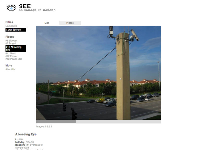 See Project's creation was to pay the public expression of respect to Invader, a Parisian Street artist. In an act to bring the game of space invaders to life and 'invade' the entire world with his work, Invader pastes up characters from and inspired by the Space Invaders game, made up of small coloured square tiles that form a mosaic [Wikipedia]...In the same spirit, See is a project who utilizes the use of small low-res graphics of classic video games not to provoke, but rather, to map a city with regards to significance, memory, spacial relevances.