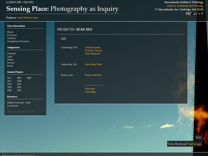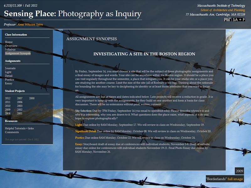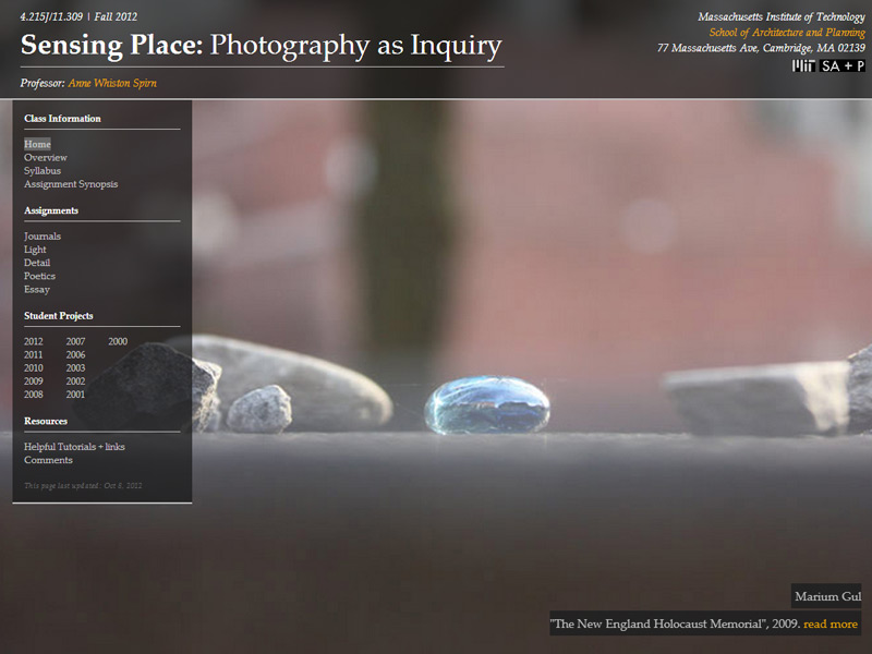 This was a site design for a photography class at MIT. This course explores photography as a disciplined way of seeing, of exploring landscapes and expressing ideas. Readings, observations, and photographs will form the basis of discussions on landscape, light, significant detail, place, poetics, narrative, and how photography can inform design and planning, among other issues. Students also learn to make personal sites and blogs in the class to host their photos.
