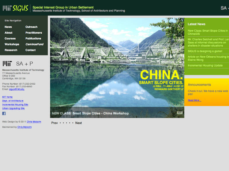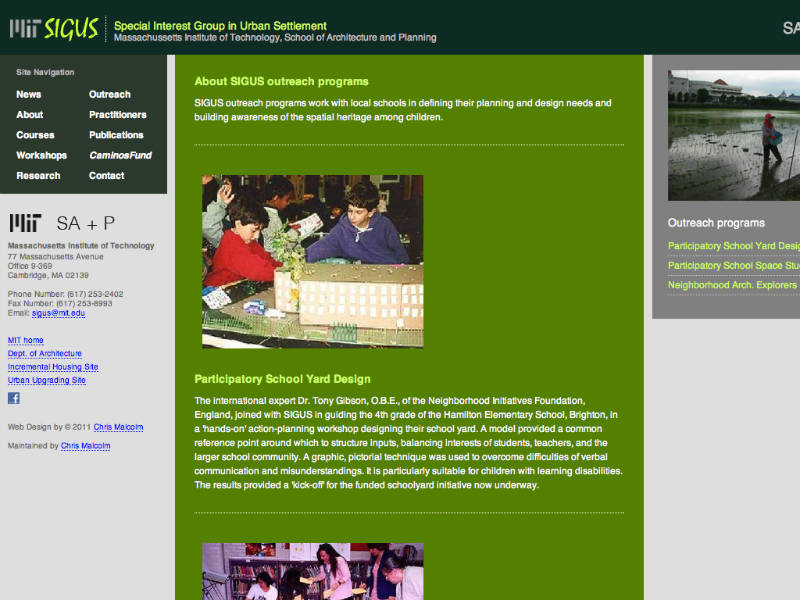 Site for the SIGUS group of MIT. Designed to inform visitors about current SIGUS outreach projects, classes, workshops, and etc.The Special Interest Group in Urban Settlement (SIGUS) links housing and community interests in the Department of Architecture and Department of Urban Studies, focusing on developing areas worldwide. SIGUS explores the new professionalism emerging for architects and planners, and concentrates on service, participation and non-traditional client groups.