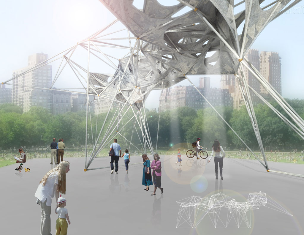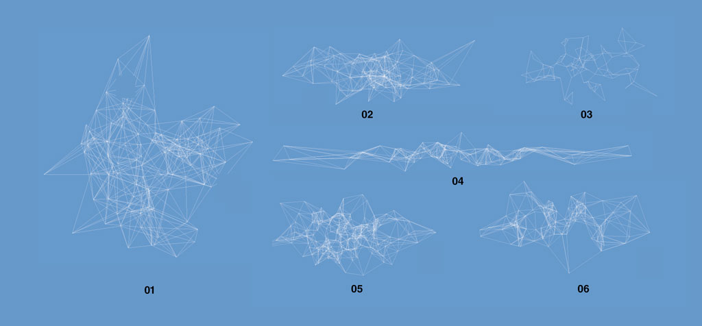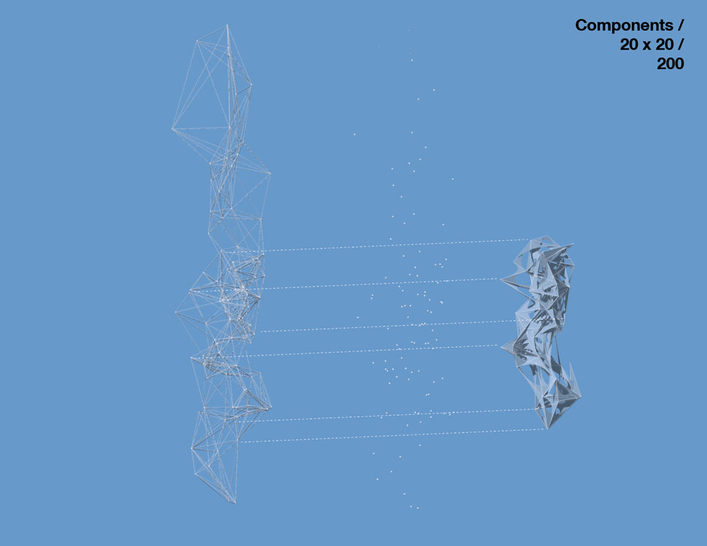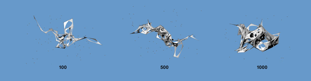 description: Point Line Surface was a project developed in a 2 week course on the process of scripting (Rhinoscript Python). Rather than having a prescribed goal to accomplish, Point line surface became a sequence of experiments that stemmed from the question of automation. How we can reverse the roles of user and tool, and allow tools to have somewhat more control over what is the eventual outcome? This project moved from creating a set of random points, and then a set of rules were set up to establish relationships between point and line, line and structure, and then finally structure to surface ..