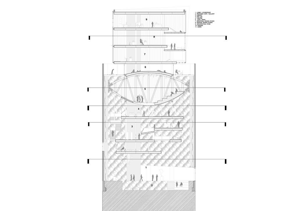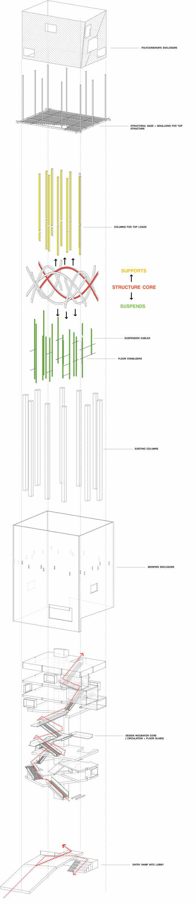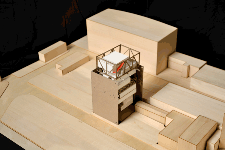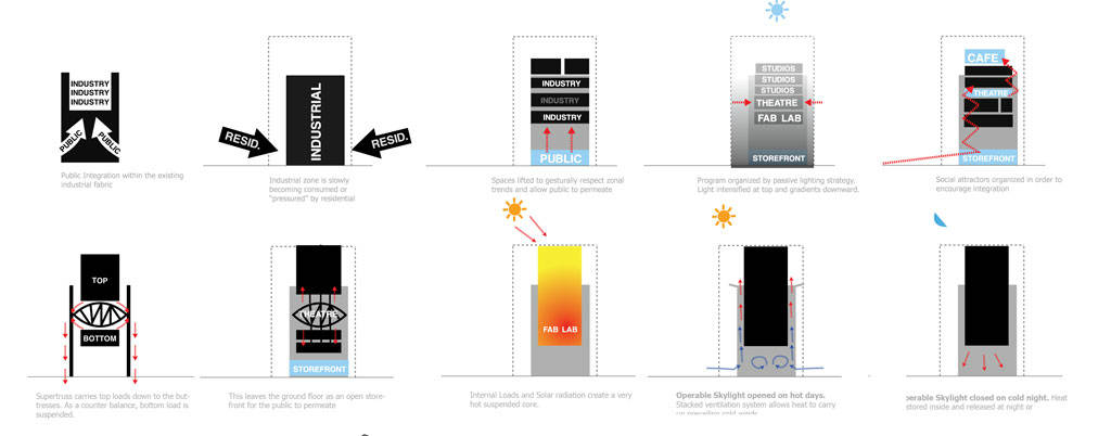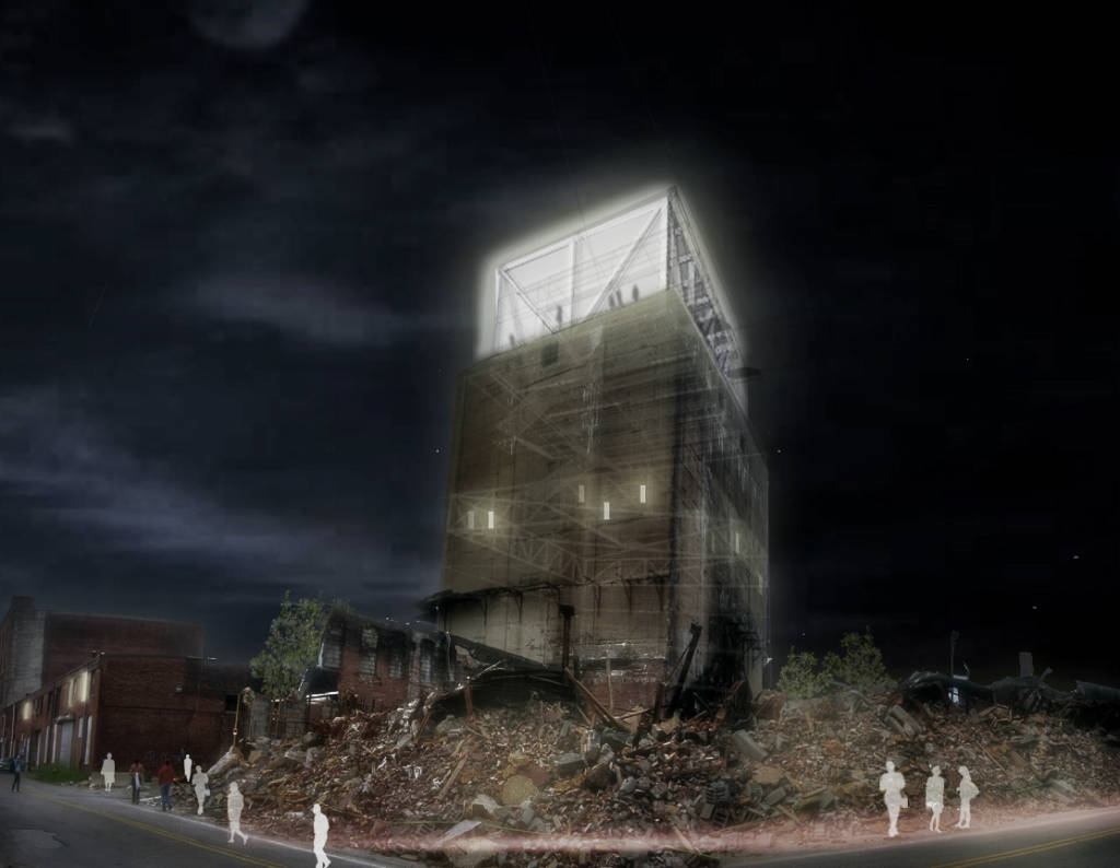 description: The Ice Tower is an adaptive-reuse project of an 8 story abandoned ice tower in Boston's industrial district, for the location of a new design collective of artists, architects, fabricators, and industrial designers. This duality was something that could be tangibly realized. So to keep the power, simplicity, and verticality of the existing mass, the addition is treated as a new fundamentally different volume suspended within.