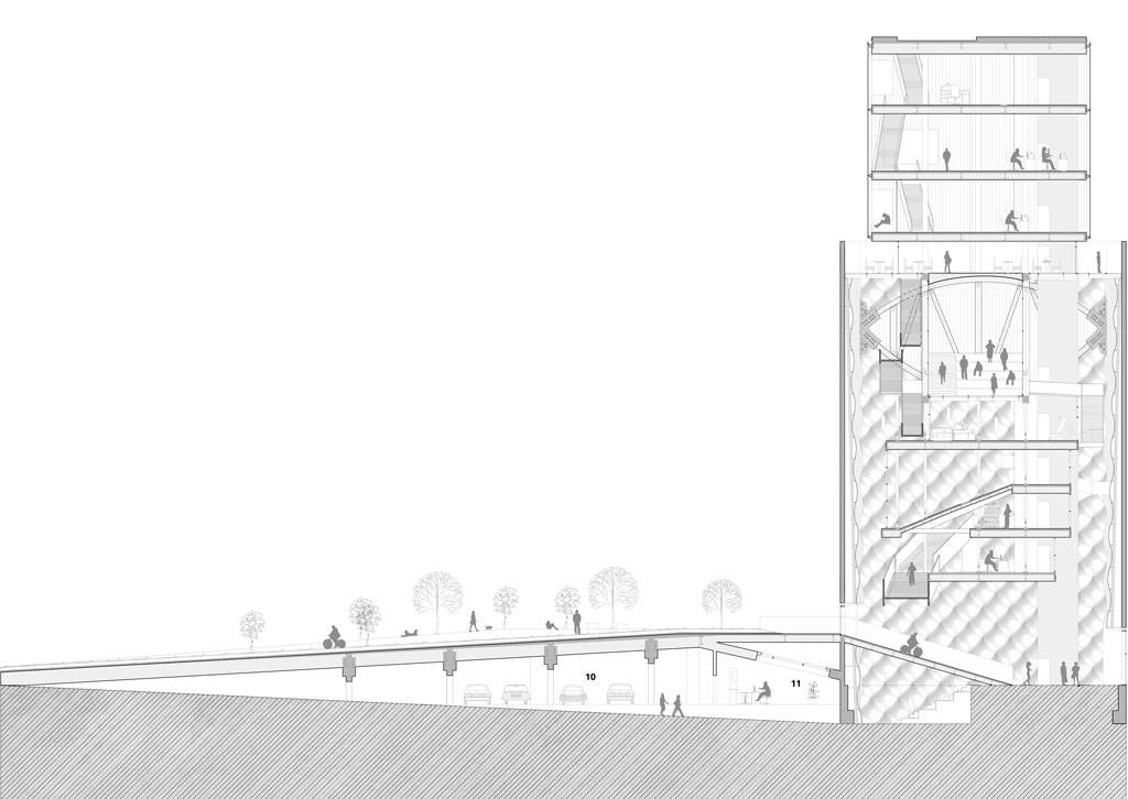 The project then begins to speak about the old and the new, where the old retains its mass and heaviness--a receptacle, an image. The new becomes this new lighter emerging entity that rises from the top of the original building.