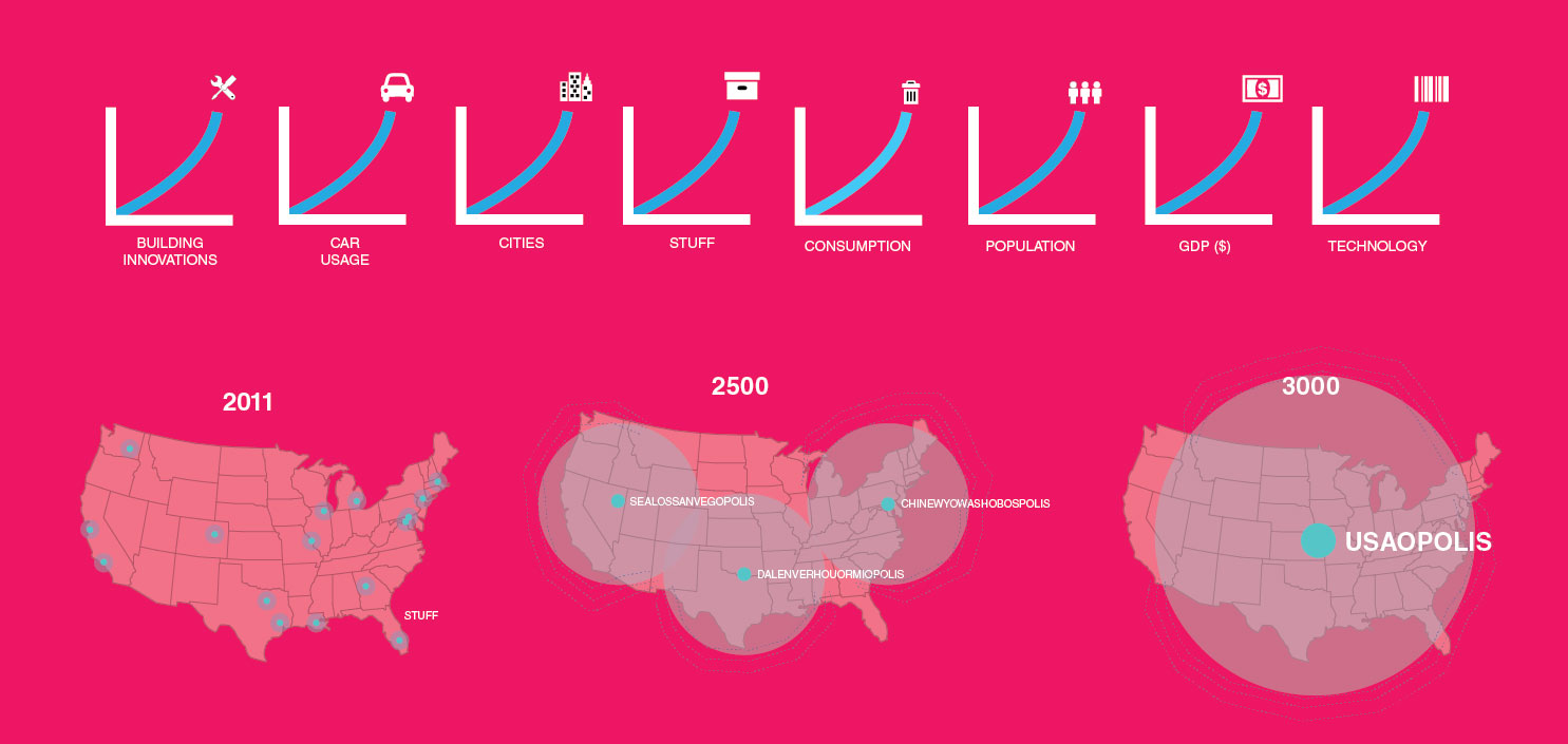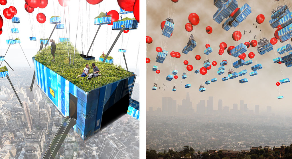 description: USAOPOLIS operates in the hypothetical realm where constant growth and density reaches a point where ground and horizontal expansion must become a completely active/in-use domain. Land Space will be dedicated to the living, using, doing. The thrown away, the unused, the idle, the excess will then belong to the skies. This project thus becomes a dystopian/utopian speculation into the ridiculousness of our accumulations, where we succumb to storing our properties and trash in the skies.