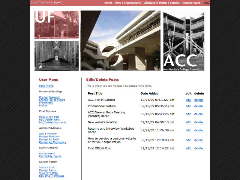 This was a site design for the Architectural College Council (ACC) for the University of Florida. The purpose of the site was to inform Architecture students of upcoming events, meetings, and all things involving the college of design, construction and planning. The site featured a robust dynamic back of house, with features such as user login, adding of events to calendars, inviting of firms to hiring fairs, custom user avatars and more.