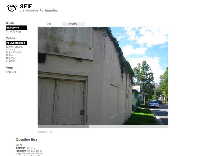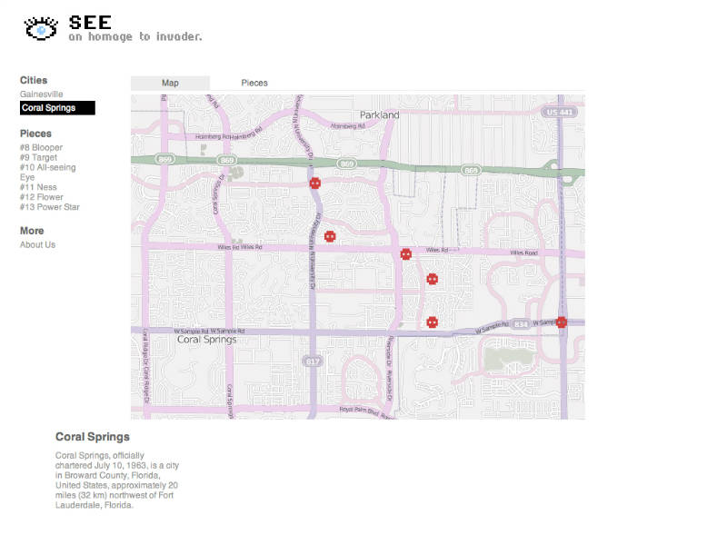 See Project's creation was to pay the public expression of respect to Invader, a Parisian Street artist. In an act to bring the game of space invaders to life and 'invade' the entire world with his work, Invader pastes up characters from and inspired by the Space Invaders game, made up of small coloured square tiles that form a mosaic [Wikipedia]...In the same spirit, See is a project who utilizes the use of small low-res graphics of classic video games not to provoke, but rather, to map a city with regards to significance, memory, spacial relevances.