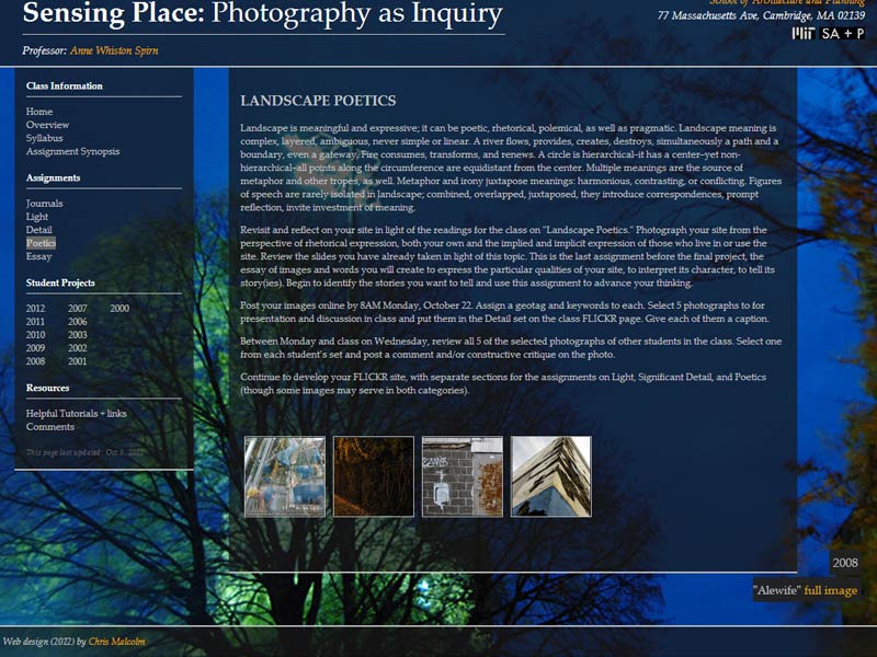 This was a site design for a photography class at MIT. This course explores photography as a disciplined way of seeing, of exploring landscapes and expressing ideas. Readings, observations, and photographs will form the basis of discussions on landscape, light, significant detail, place, poetics, narrative, and how photography can inform design and planning, among other issues. Students also learn to make personal sites and blogs in the class to host their photos.