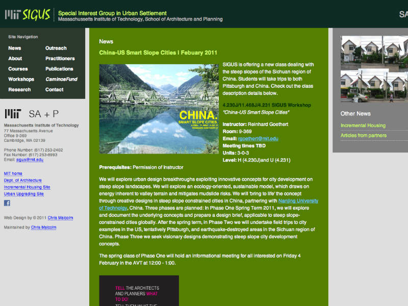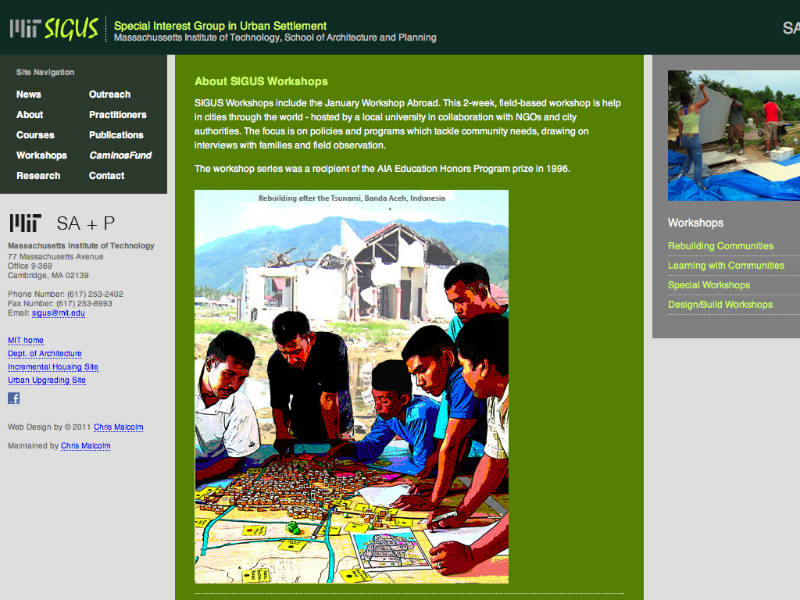 Site for the SIGUS group of MIT. Designed to inform visitors about current SIGUS outreach projects, classes, workshops, and etc.The Special Interest Group in Urban Settlement (SIGUS) links housing and community interests in the Department of Architecture and Department of Urban Studies, focusing on developing areas worldwide. SIGUS explores the new professionalism emerging for architects and planners, and concentrates on service, participation and non-traditional client groups.
