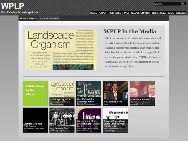 Redesign of the wplp.net website. For more than twenty-five years, the West Philadelphia Landscape Project (WPLP) has worked in the Mill Creek watershed and neighborhood. Their mission is to restore nature and rebuild community through strategic design, planning, and education projects.